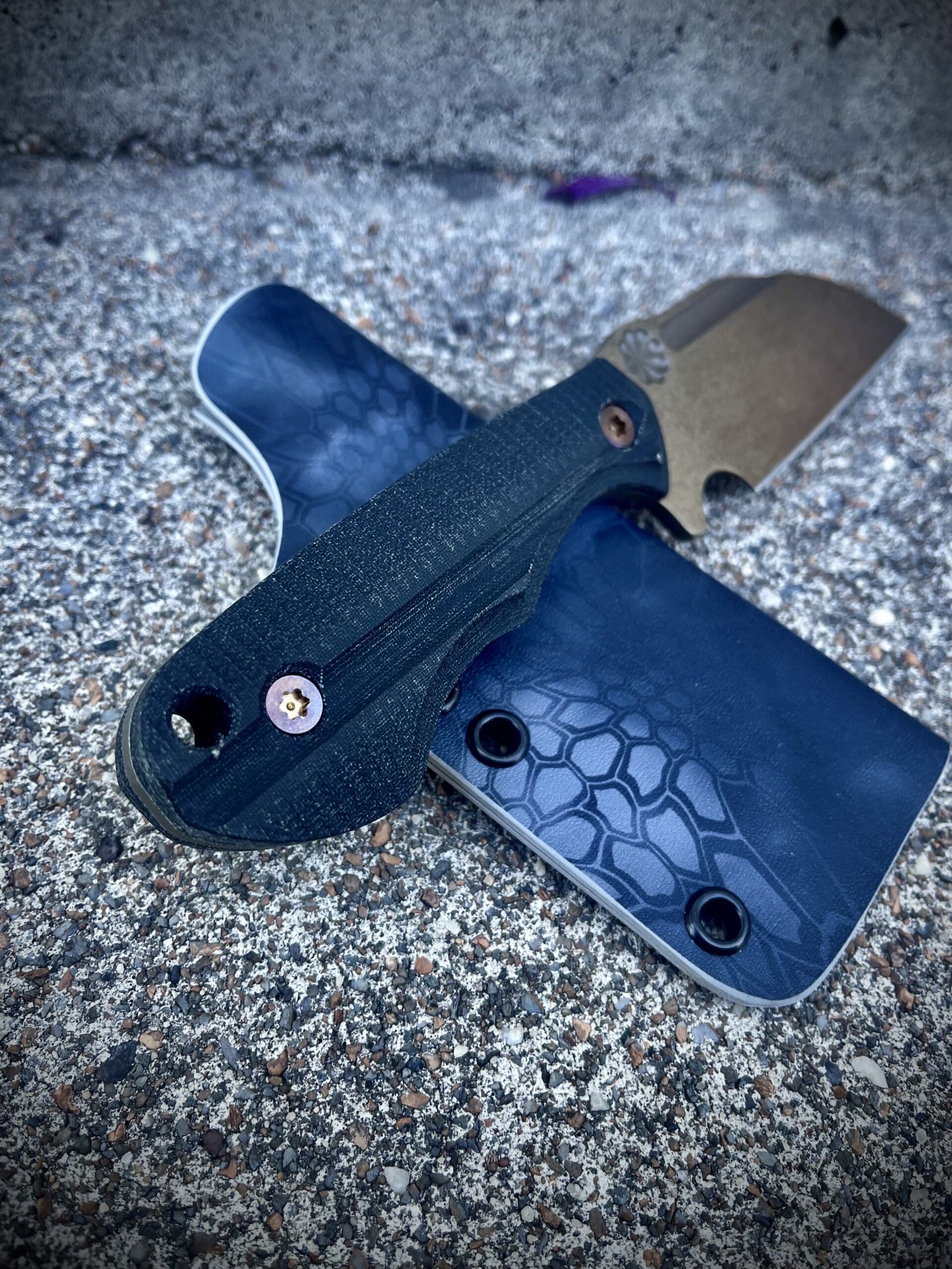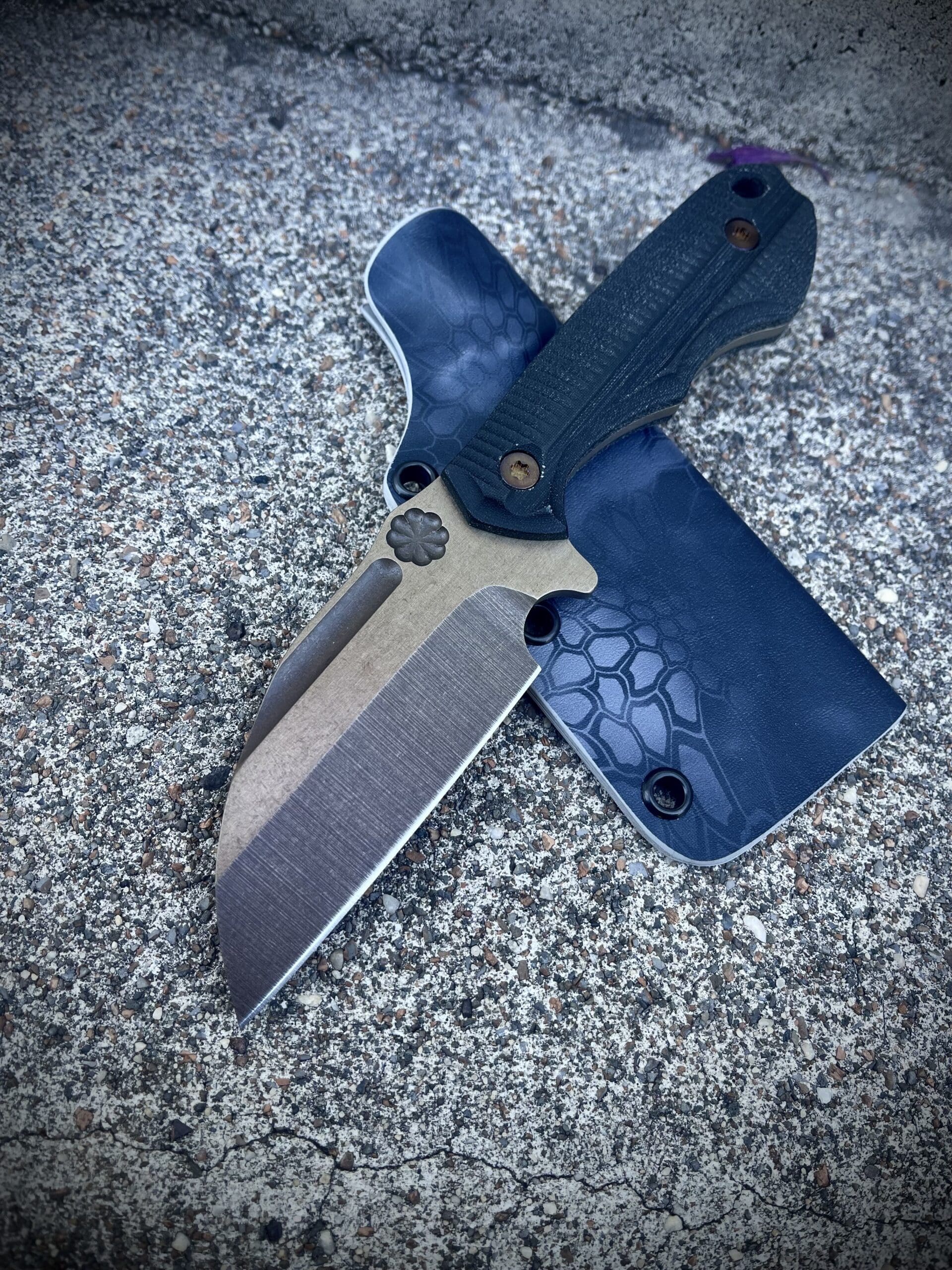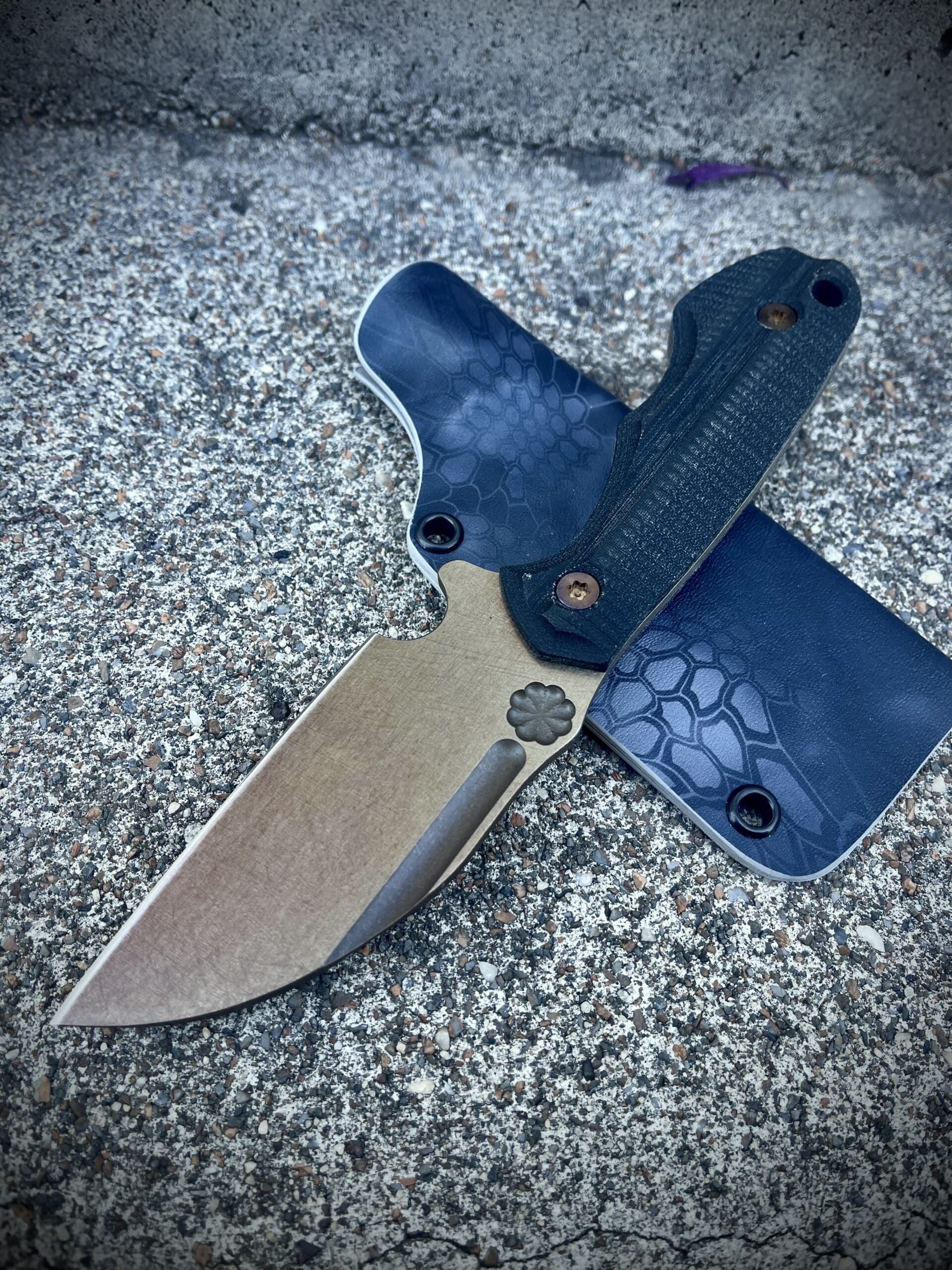 This one has a chisel ground .156" D2 blade with temper Ano and Black linen Micarta scales